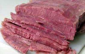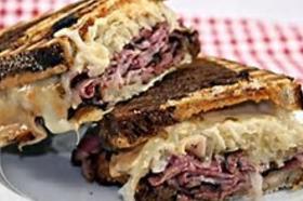 hand carved red brisket drizzled with spicy or yellow mustard on thick-cut marble rye